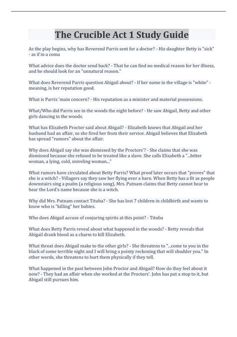 Read Online The Crucible Act One Study Guide Answers PDF online is a convenient and frugal way to read The Crucible Act One Study Guide Answers you love right from the comfort of your own home. Yes, there sites where you can get PDF "for free" but the ones listed below are clean from viruses and completely legal to use.